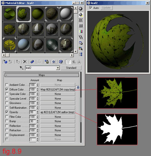 In Material editor make a standard material. For Diffuse use a map of leaf and for Opacity use the same map but in grayscale (fig. 8.9)