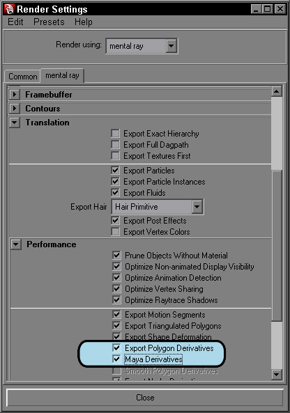 The best way for this is to compute the normal map with the software that will assure no problems in the end , for this project i used maya for rendering and i had to compute the normal maps within maya to make sure they will render properly.If you are using normal maps computed within maya ( with transfer maps tool ) and want to render with mental ray renderer within maya than make sure to check that in the Render Settings dialog -> mental ray tab->Translation->Performance you have checked Maya Derivatives (like in the image below – note that this option is off by default) this way you will use Maya’s derivatives calculation for bump mapping providing compatibility with Maya for mental ray, also note that this option is only available when Export Polygon Derivatives is also on.