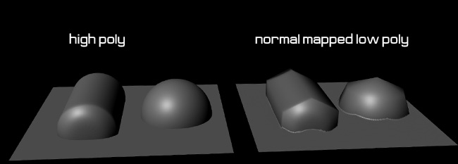 then the low poly with normal map will look better viewed at slanted angles ( of course ,depending on the polygon budged you could add more geometry to get rid of the rugged look )
