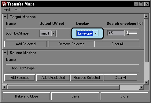 -as a note make sure to save the file before you hit the bake button because after rendering the texture maya will delete the envelope and you might need it again ( especially if you spent some time tweaking it to better enclose the high rez ) or if your map does not look ok and need to rebake make sure to undo a couple o steps until the envelope pops up in the scene again ( saving the scene is safer though :) )