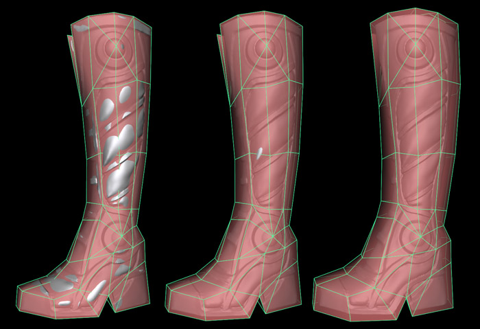Though the low/diffuse/high workflow might have some advantages ( like the low poly version of the characters will be ready to go down the pipeline to animators earlier in the process ,or the creation of the highrez version will be quicker if you work carefully and keep lots of selections into the diffuse psd file than you can later on apply as displacemets on the high rez mesh) it has one big disadvantage and i will picture it in a quick example.