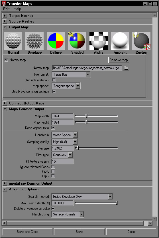 -if the normal map does not look ok from the first time come back again to the transfer maps dialog and readjust some settings ( but when you have an envelope that completely encloses the high its less likely problems will occur … you will have some hard time if the envelope intersects with the high rez … if you are too lazy to tweak the envelope you could set the searching method to "inside then outside" or to "closest to envelope" ; there are situations when it might work and situations when you will have problems : usually you will have problems when multiple surfaces intersects on the high rez version , lets say some straps on top of the arm … in those cases if the envelope intersects with the high geometry also then it might sample the wrong surface)