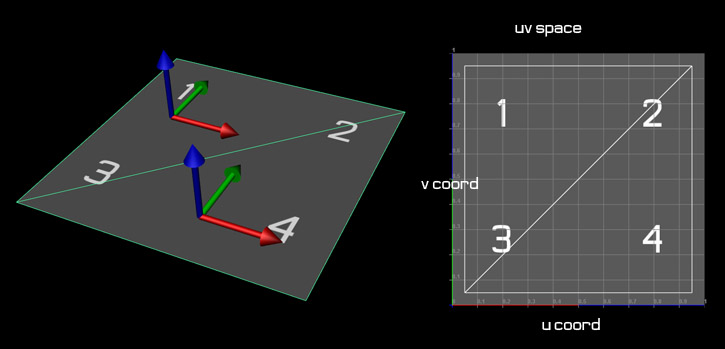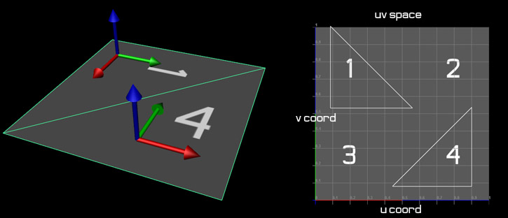 Now lets say that i will cut the UVs along the edge and will rotate one shell 90 degrees CCW like in the image below.Because of the rotation in UV space the tangent space for the first triangle will be different than in the first situation ( the RGB triad for the first triangle has rotated also 90 degrees along blue axis )