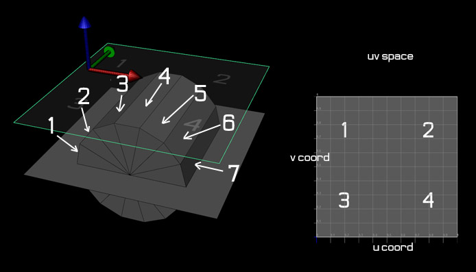I will bake the normals from the plane and cylinder below to a single quad plane highlighted in green.As i explained earlier the tangent space will be : normal pointing up( blue one) tangent from left to right ( 3-4 red one) and bitangent/binormal down-up (3-1 the green one) . The cylinder has all the edges hard so the normals will change in steps, it will be easier to analyze.I have numbered the faces on the cylinder from 1 to 7.