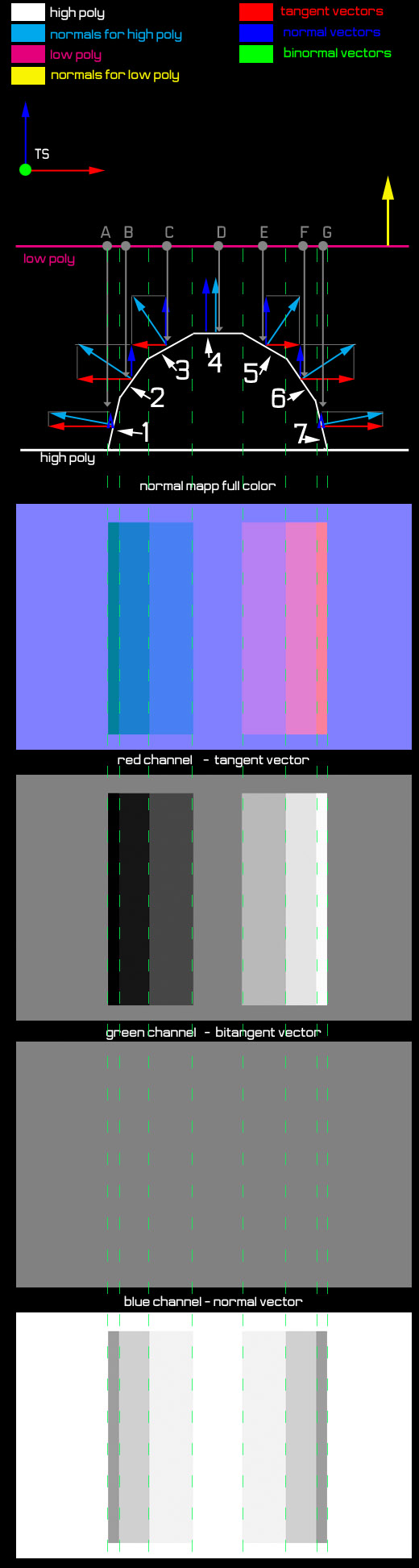 Below the color codes you see the TS ( tangent space )triad :tangent(red left to right ), normal (blue down to up) and binormal (green and perpendicular to the screen pointing from you to the screen); notice in the figure above that all the faces from the high version are parallel with the green arrow ( binormal in tangent space ) ,excluding the triangles that will cap the cylinder and that will not be visible in the normal map anyway.