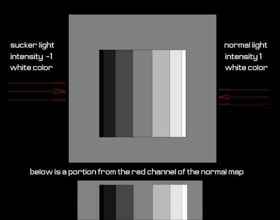 -create a "sucker" directional light ,i do not know if you are familiar with the term :) "light suckers" … i have seen them named like that on some forums and i will name them the same … it will be a light with a negative intensity … so when rendering the "sucker" light actually will subtract ,"suck" light thus darkening the scene … pretty handy when you have overbright areas in the scene and if you adjust the attributes for the lights already in the scene you will mess the lighting in other areas … this way you can add a sucker light and fix the problem, … so add a sucker light with color full white and intensity -1 coming from left also parallel with the screen ( so both lights will be in tangent-binormal plane )