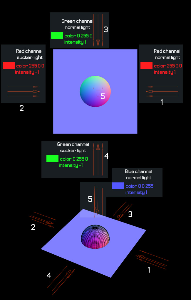 Same applies for the green channel if you test, this time the same normal light will come from top and the sucker light from below ( also same lights in tangent- binormal plane ).