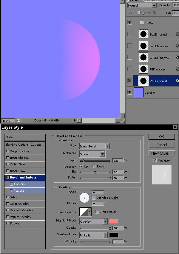 for Red normal light apply an effect like below (bevel and emboss), uncheck use global lighting ,set the angle to 0 (the light will come from right),set altitude to 0 (light parallel with the screen) ,highlight mode set to overlay with color 255 128 128 (RGB) to lighten only the red channel and opacity to 100% , set opacity for shadows to 0 (don’t need that)