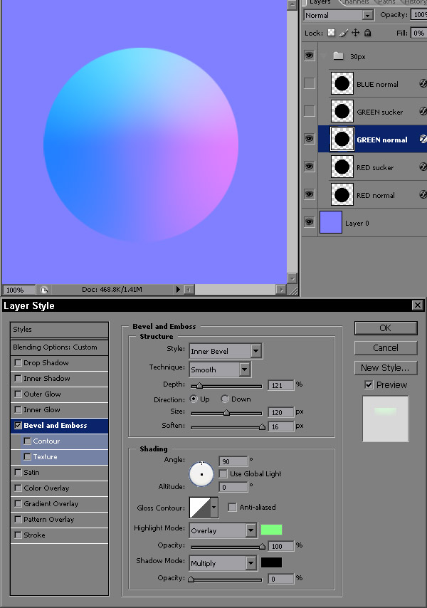 for Green normal light paste the same effect but change the angle to 90 deg (light coming from top) and change color for the highlight to 128 255 128 to lighten only the green channel