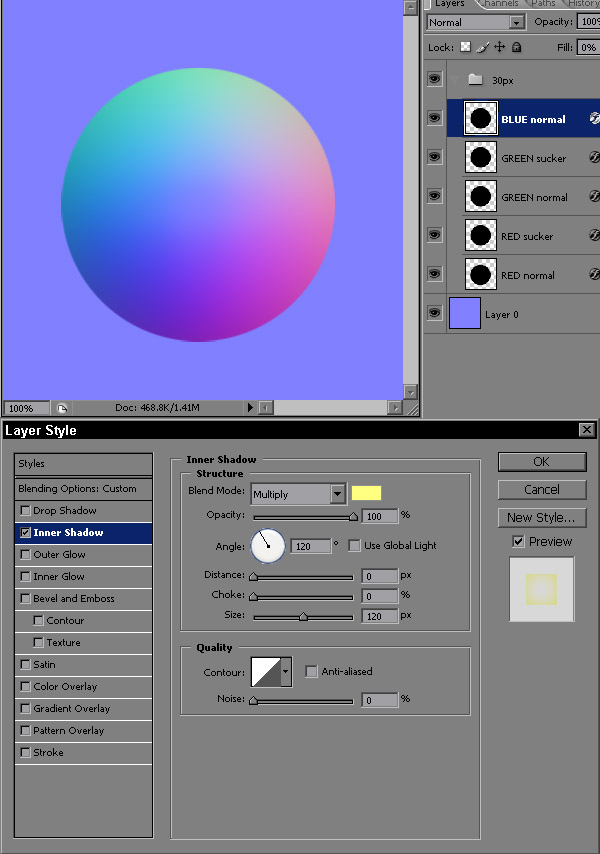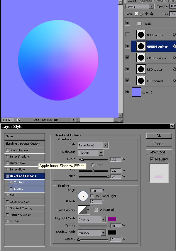 and finally for the blue channel apply an inner shadow effect , uncheck global lighting , distance 0 , choke 0,set size to whatever you had for the size of the bevel and emboss and set color to 255 255 128 to darken only the blue channel , opacity to 100