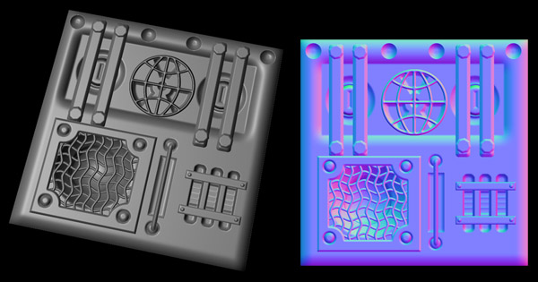 I will show an example and explain how the normal map will be computed and how to interpret it channel by channel… this will help if you want to alter the normal maps in photoshop , overlay multiple normal maps , paint them directly in photoshop etc …