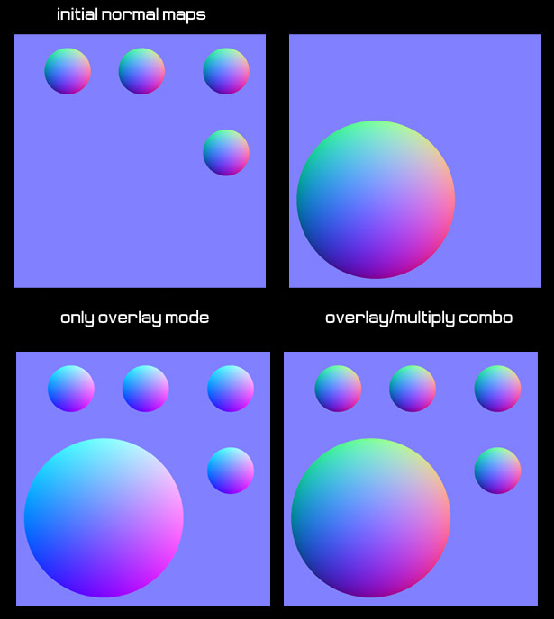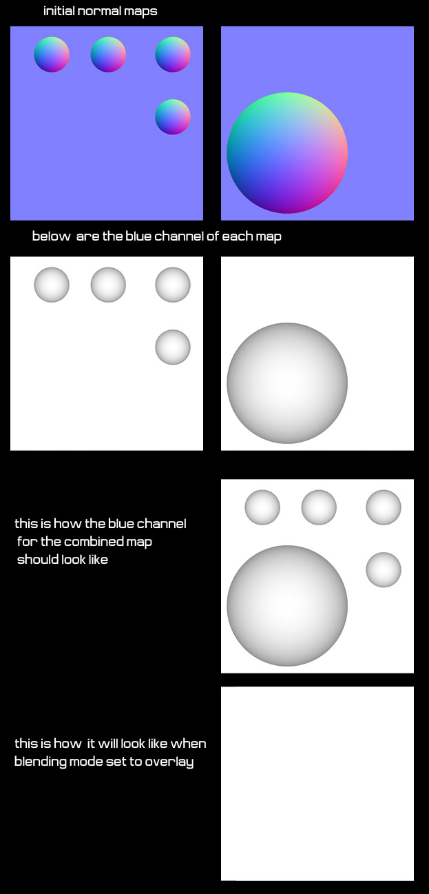 Another thing you could do is to overlay two normal maps inside photoshop , i have seen a lot of people actually setting the blend mode to overlay and call it final …. this is not quite a good method and i will show you why in the next image ; lets say we want to overlay the normal map in the right on top of the left one ; you can see how the blue channel is looking for each map and how it should look for the combined image …but when setting the mode to overlay because the blue channel is almost white it will completely wipe out any detail in the blue channel and the composite normal map will look wrong.