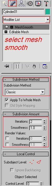 Then apply a mesh smooth by clicking on the blue rainbow, scrolling down the modifier list and selecting Mesh smooth. Then set Sub division mode to Classic and Iterations to 2